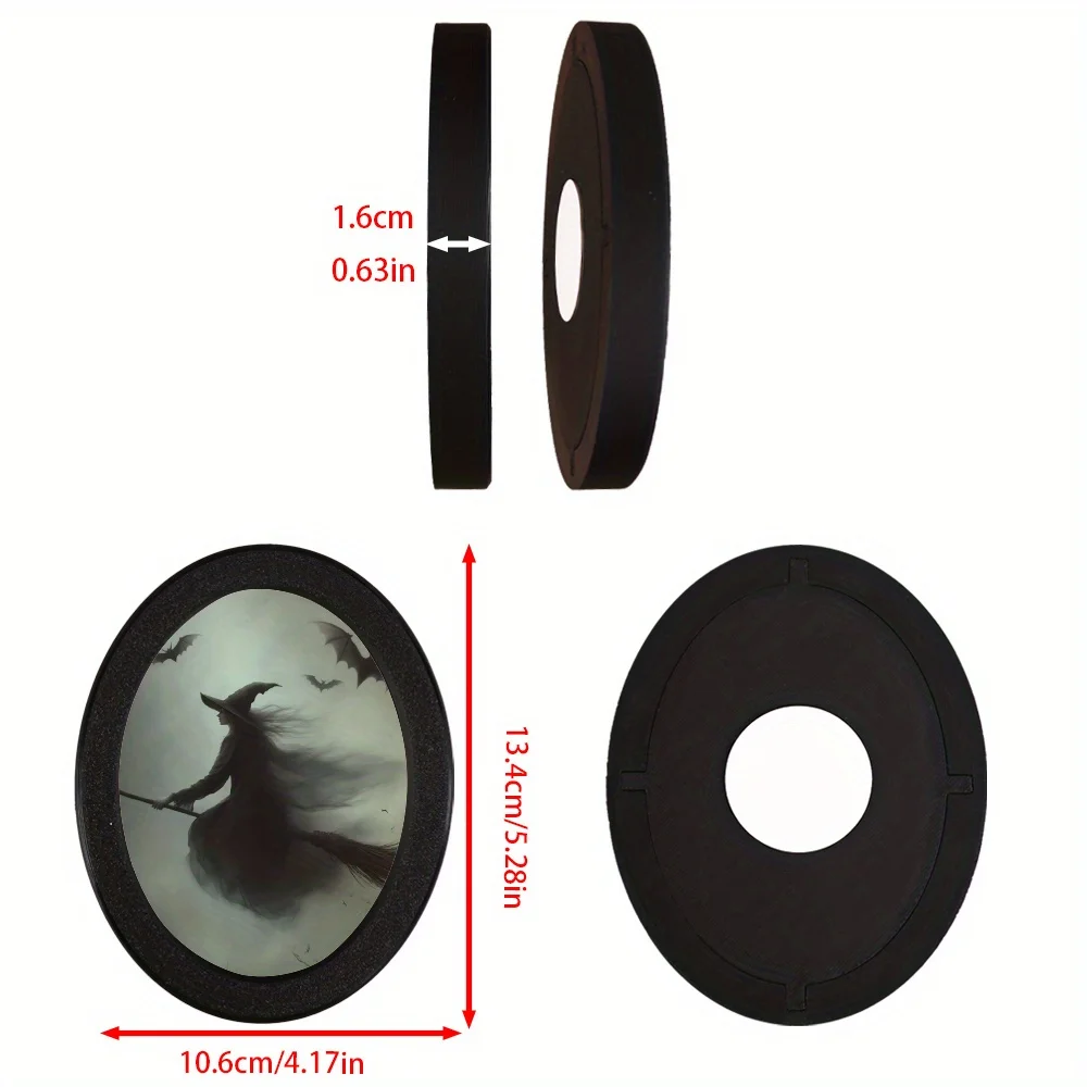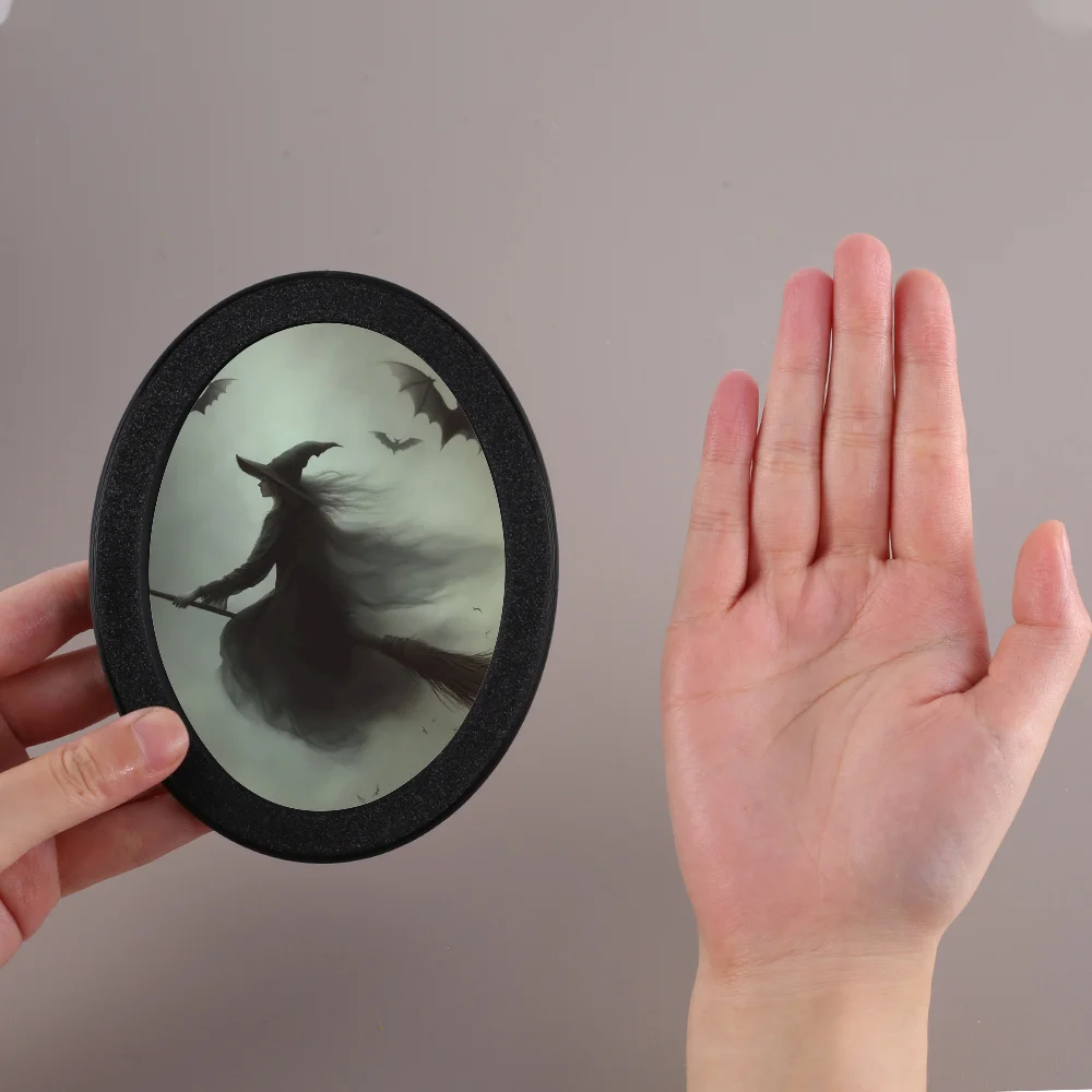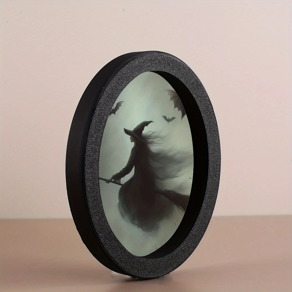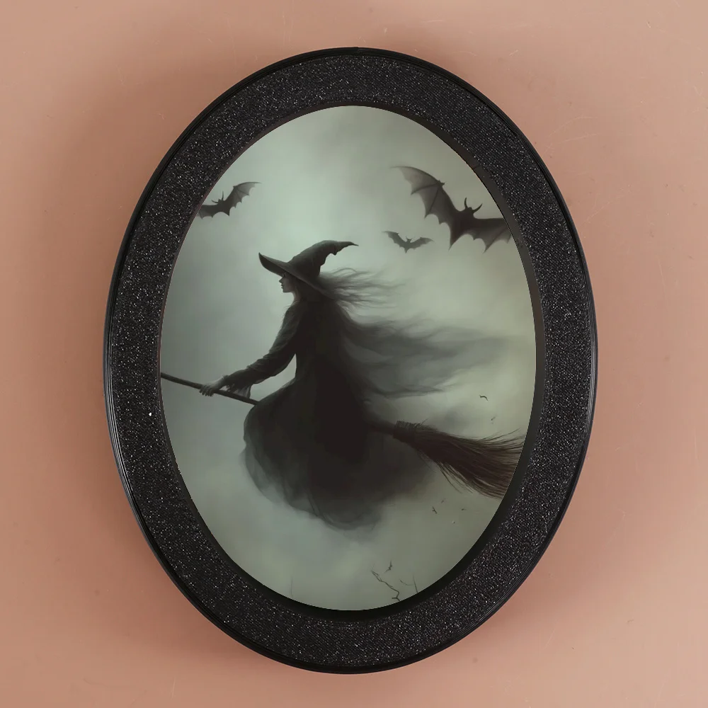 Oval Witchcraft Frame for Halloween - Witch Flying on a Broom with Bats and Fog