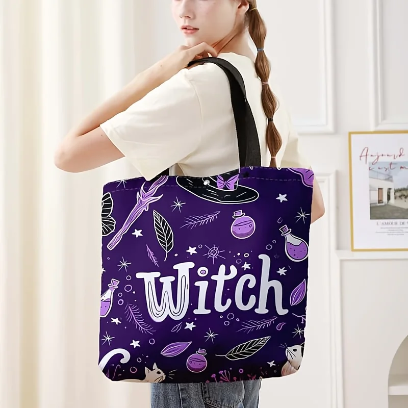 Witchcraft-Themed Purple Tote Bag with Spellbook & Broomstick Design - Lightweig